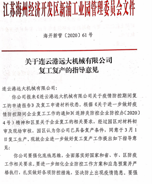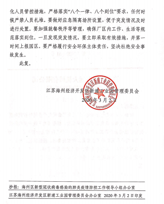 在前期的精心準(zhǔn)備下,我公司已于3月1日通過疫情防控、安全生產(chǎn)、環(huán)保生產(chǎn)三項驗收,3月2日獲得復(fù)工批文并于今日正式復(fù)工。公司將強化底線思維,全面落實好國家和省、市、區(qū)防疫工作的相關(guān)要求。在扎實做好各項防控措施的基礎(chǔ)上,堅決杜絕疫情的發(fā)生。